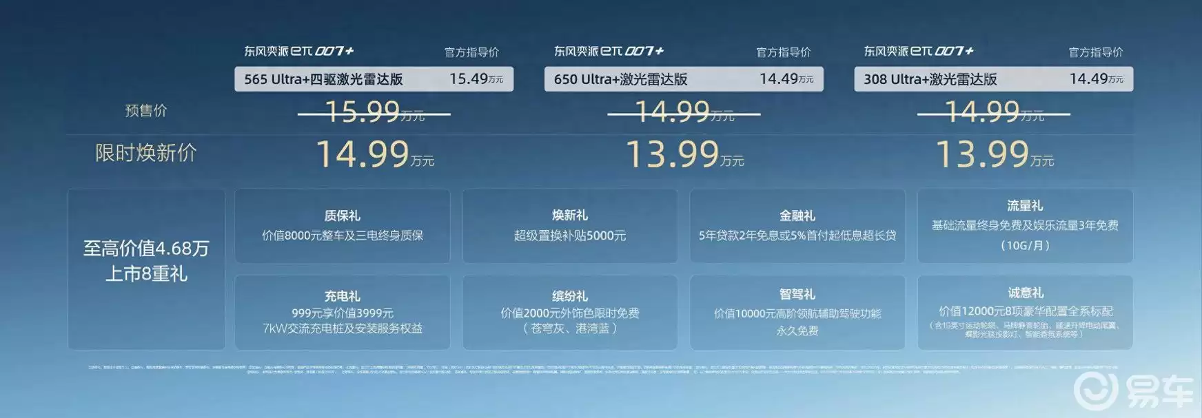东风奕派旗下全新中大型轿车eπ007+近日正式上市,推出三款不同配置车型。官方指导价区间为14.99万元至15.99万元,限时优惠后起售价下探至13.99万元。作为eπ007的升级版本,新车在智能驾驶系统、座舱硬件配置、外观设计及续航能力等方面实现全方位突破。