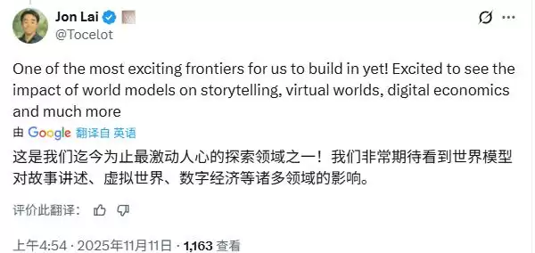 非常期待看到世界模型将如何改变我们讲故事、构建虚拟世界乃至发展数字经济的方式。