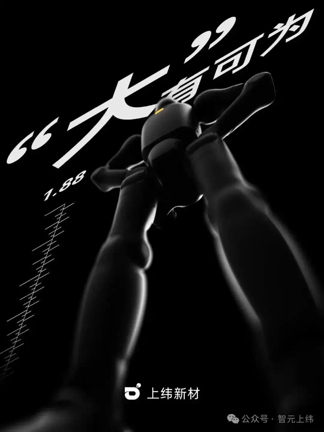 消息面上,当天11点11分,微信公众号“智元上线”发布两张图片,内容均为人形机器人造型,分别配有“大有可为”和“敬观其变”的文字说明。值得注意的是,第一张图片上标有数字1.88,这似乎暗示该款机器人将采用1.88米的全尺寸设计。
