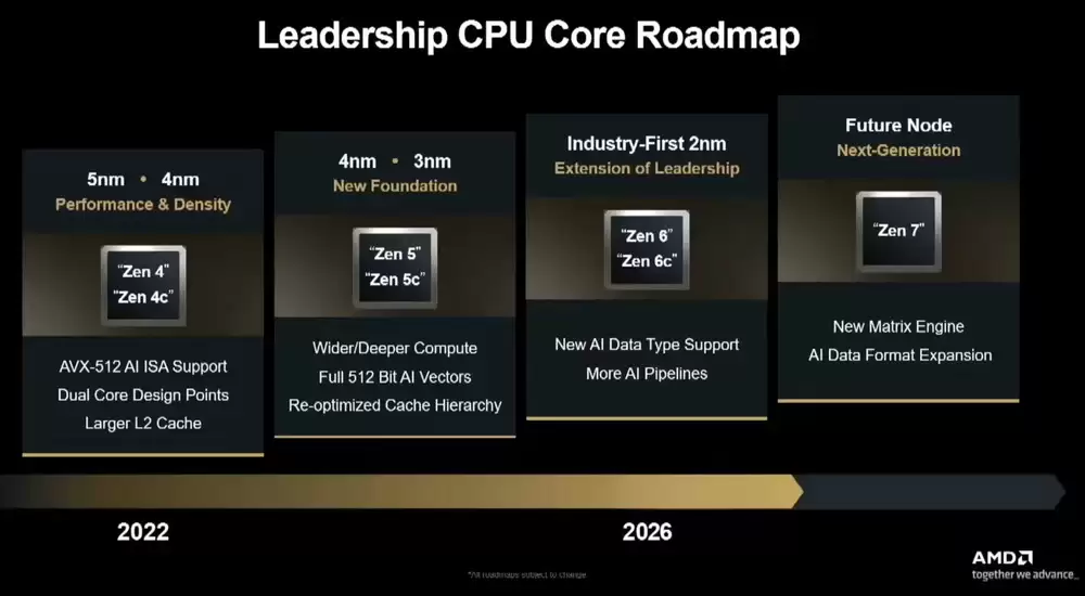与此同时,这份路线图还提到Zen 7将作为其"下一代真正的技术飞跃",率先采用2nm制程工艺。这也是Zen 7架构首次出现在AMD的官方规划中,预示着该架构预计将在2026年后正式发布。