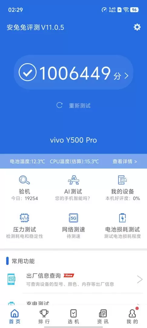 硬件性能方面,vivo Y500 Pro搭载了天玑7400处理器,采用先进的4纳米制程工艺,拥有4颗Cortex-A78和4颗Cortex-A55核心组成的八核架构,性能表现强劲且功耗控制出色。在安兔兔跑分测试中,这款手机获得了超过100万分的成绩,在同价位机型中表现出色,足以应对日常使用和主流游戏需求。以热门游戏《王者荣耀》为例,在高画质设置下运行,游戏过程几乎感受不到卡顿,画面流畅细腻,技能释放响应迅速,多人团战时帧率依然保持稳定,为用户带来沉浸式游戏体验。同时,该机在散热方面也表现不俗,采用先进的散热技术,长时间游戏后机身温度仍能维持在合理范围,有效避免了因过热导致的降频现象,确保持续稳定的性能输出。