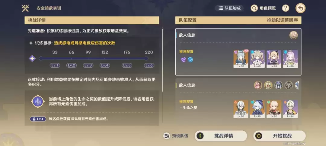 上半挑战中可配上【伊涅芙-试用】+【前台雷/水系角色】+【后台挂雷/水角色】*2(需累计感电/月感电次数,因此前台角色是能频繁造成水/雷元素伤害的角色)