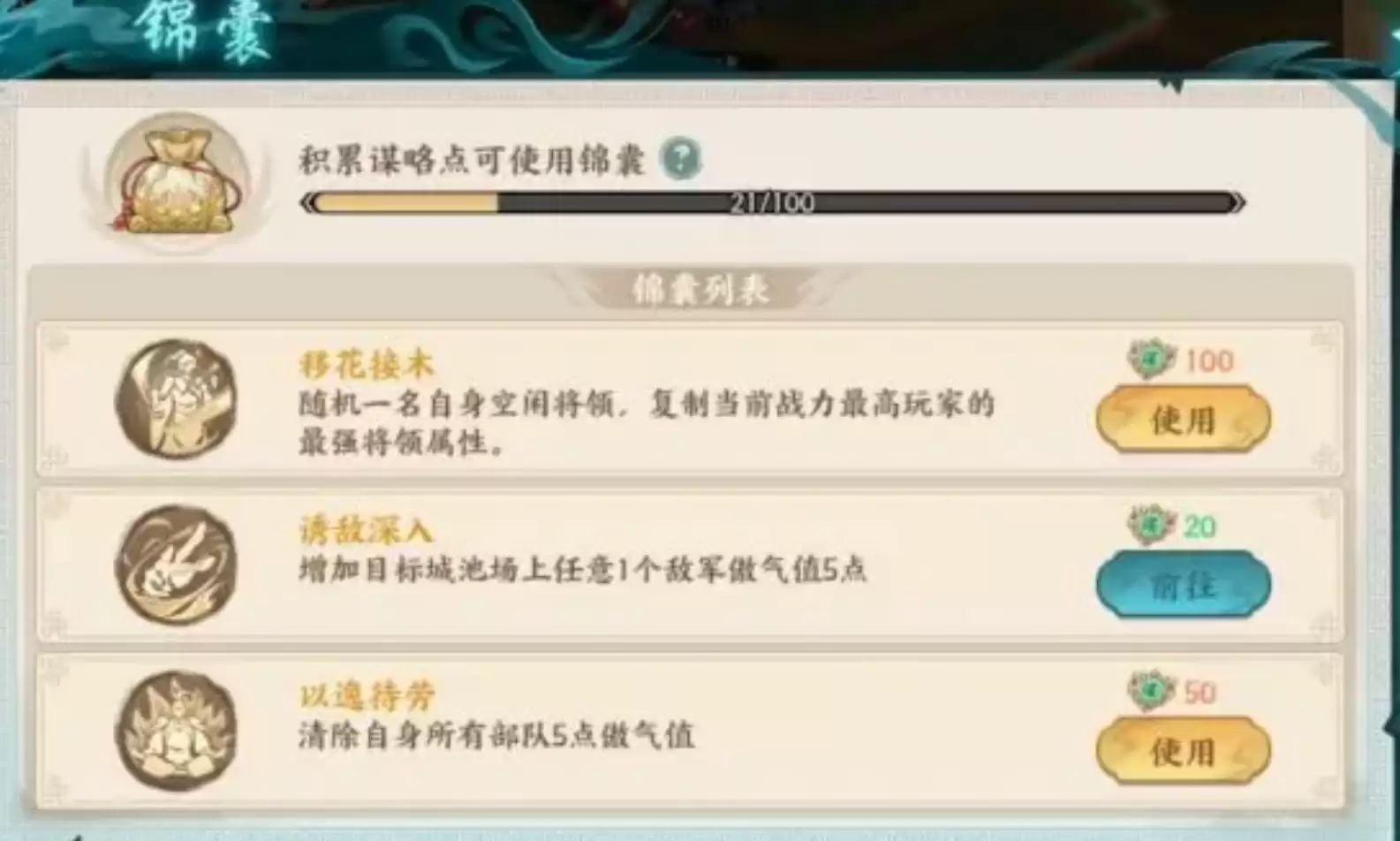 每次成功击败敌人或完成随机事件后,玩家还能获得谋略点奖励。这些谋略点可以在锦囊界面激活不同的阵营增益效果,为阵营内的所有玩家提供强力加成,显著提升作战效率。等到跨服军演活动结束后,系统会统一计算所有阵营获得的总积分,并按照积分排名发放对应的阵营奖励(以及个人奖励)。在个人奖励中,除了必定能获得的军演币外,表现出色的玩家还能收获军神称号以及更多宝箱奖励;而阵营奖励则会为玩家提供丰厚的元宝。