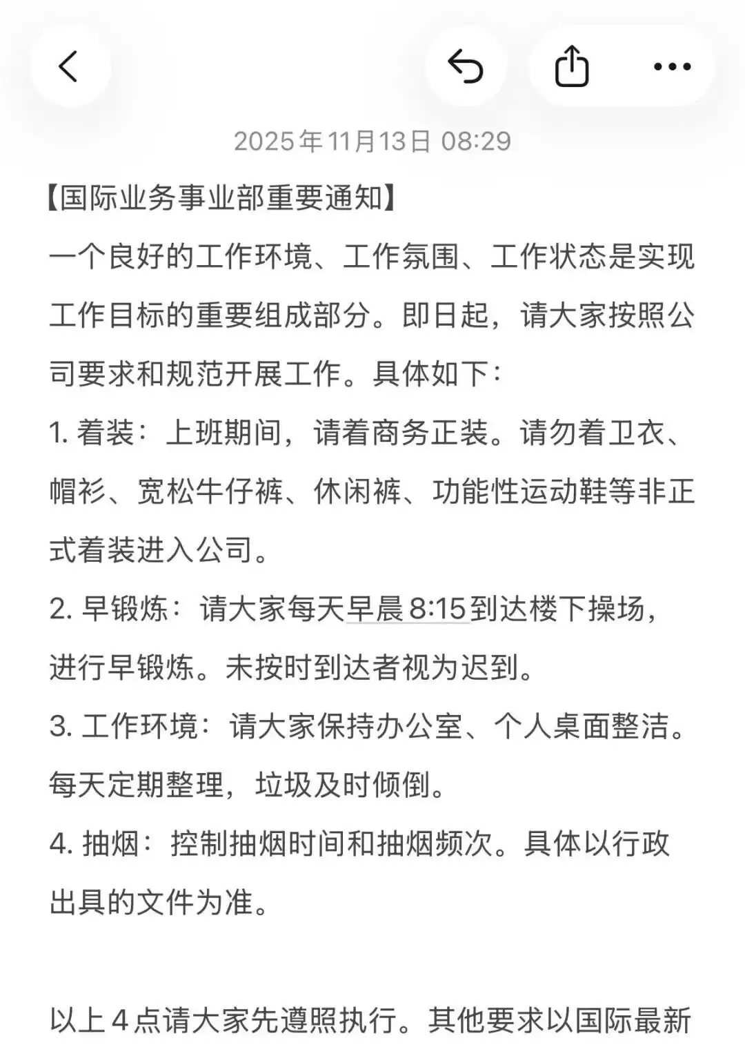 新规明确提出"早锻炼考勤"要求,员工每天需在8:15前抵达操场参与晨练,迟到者将直接按旷工处理。在着装方面,公司要求全员统一穿着商务正装上班,卫衣、牛仔裤等休闲服饰被明令禁止。此外,新规还要求员工每日整理办公桌面,确保工作环境整洁有序。
