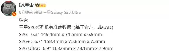 知名数码博主@i冰宇宙发布的信息显示,Galaxy S26系列三款机型在尺寸设计上各有侧重。其中,标准版Galaxy S26将继续主打紧凑机型定位,配备6.3英寸屏幕,机身三围为149.4×71.5×6.9mm,这种精巧设计在确保轻薄手感的同时,也兼顾了单手操作的便利性。作为中高端机型的Galaxy S26+则采用6.7英寸显示屏,三围尺寸为158.4×75.8×7.3mm,宽度和厚度的适度增加是为了容纳更大容量电池以及更完善的散热结构,但整体尺寸仍控制在主流范围内。顶配机型Galaxy S26 Ultra搭载了6.9英寸大屏,机身尺寸达到163.6×78.1×7.9mm,是全系中尺寸最大的机型。不过,与前代S25 Ultra相比,其厚度减少了约0.3mm,在当前超大屏旗舰机型中显得更为克制。