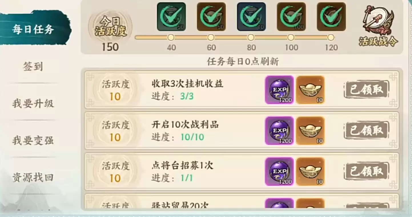 要注意的是,部分副本需要通过等级来解锁,因此在大家等级不高时,可能出现前面几项任务都做完了,但活跃值还没满的情况。此时大家可考虑去完成一些需要投入成本的任务,来把剩下的活跃值补满,例如用点将令进行点将等。此外,当大家拿完所有的活跃值礼包后,如果还有能获取经验值的任务没完成,最好也把它们做完,别把这部分的经验给浪费掉。