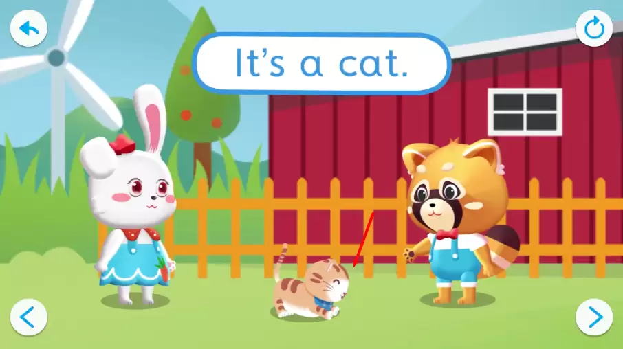 3. 学习过程中,首先出现的单词是"cat",同时配有例句"it’s a cat"及中文释义"这是一只猫",帮助孩子理解词汇含义并加深记忆。