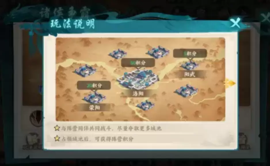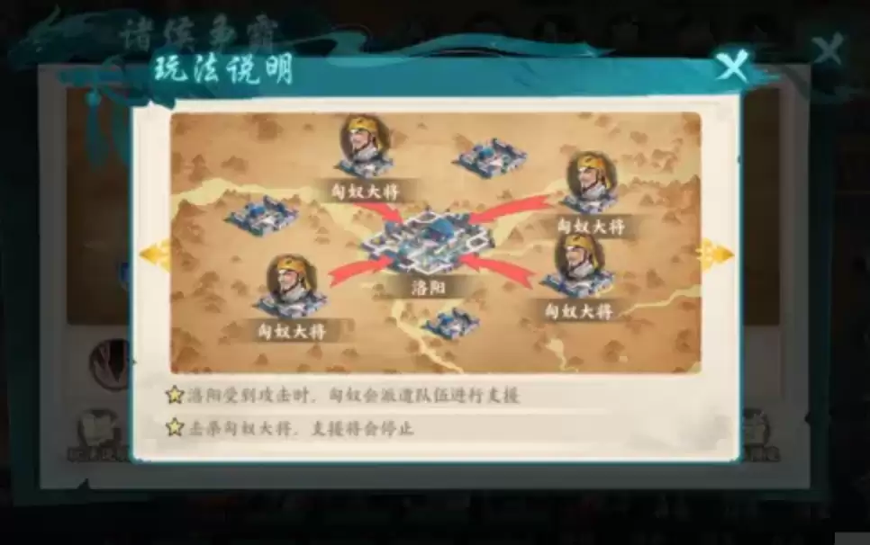 在玩法规则上,诸侯争霸延续了《百战群英》以城战为核心的特色。只有与己方兵营相连的城市才能被攻击和占领,因此连线和防守成为战略部署的关键。玩家应当与本阵营其他成员协同作战,切勿孤军奋战。占领城池后阵营会持续获得积分,若连接被切断则无法继续积分。在争夺洛阳时,会触发特殊事件——匈奴部队来犯。击杀匈奴大将可以阻止其支援,占领匈奴领地后还会周期性刷新"匈奴异兽",对其造成的伤害越高,击杀后获得的奖励就越丰厚。