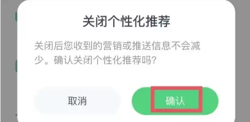 第四步:系统会弹出一个确认对话框,在这里点击确认按钮,即可成功关闭个性化推荐功能。