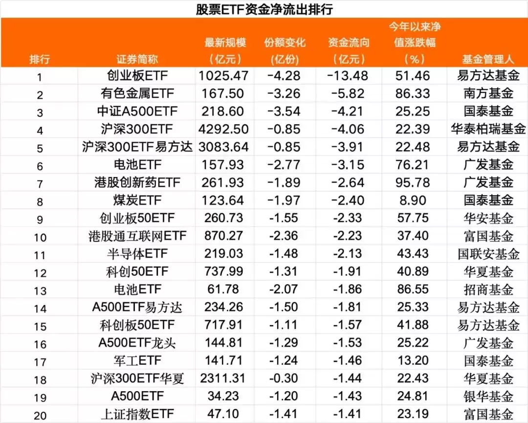 在净流出前二十大股票ETF中,宽基方面,2只创业板ETF合计资金净流出超过15亿元;3只沪深300ETF资金净流出接近9.5亿元;4只中证A500ETF资金净流出接近9亿元。行业主题方面,单只有色金属ETF净流出超5.8亿元,2只电池相关ETF合计净流出5亿元,煤炭、半导体、军工等方向ETF净流出也偏多。