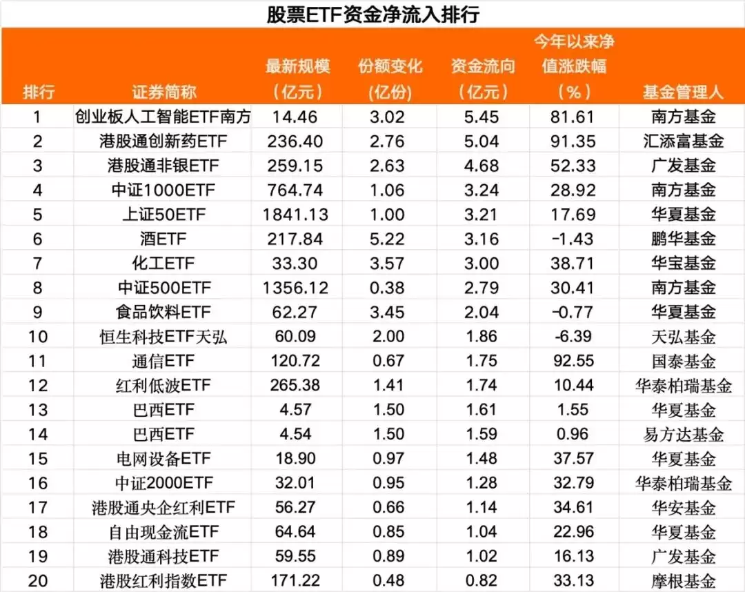 从资金净买入排行看,当日净流入1亿元以上的股票ETF有19只,行业主题ETF净流入居前。其中,创业板人工智能ETF南方、汇添富港股通创新药ETF、广发港股通非银ETF位居前三,资金净流入均超4亿元。