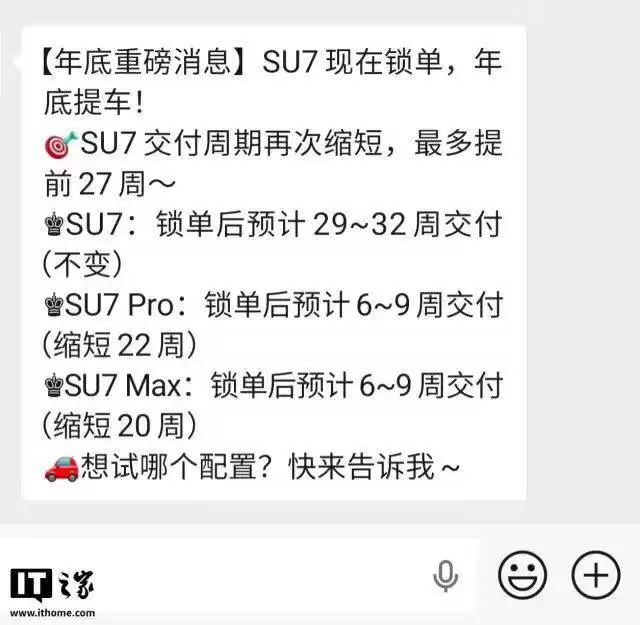 具体来看,SU7 Pro版锁单后的预计交付时间已缩短至6到9周,相比之前整整减少了22周。这一调整无疑让期待这款车型的消费者们喜出望外。同样,SU7 Max版锁单后的预计交付时间也缩短至6到9周,足足提前了20周,进一步提升了消费者的购车体验。
