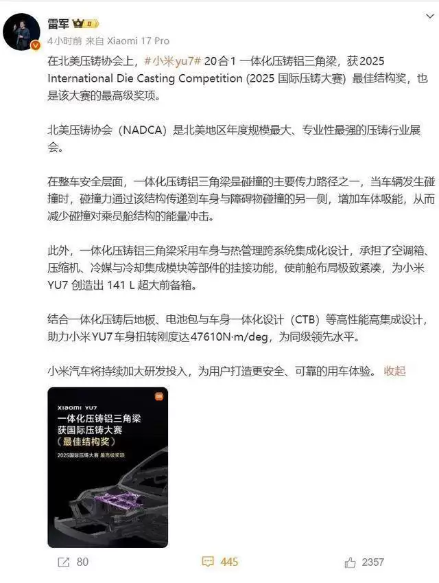 小米汽车再次证明了自己在安全技术领域的卓越实力。旗下旗舰车型YU7搭载的20合一压铸铝三角梁技术,近日斩获北美压铸协会主办的2025年国际压铸大赛最佳结构奖。这项被誉为全球压铸行业"奥斯卡"的殊荣,不仅印证了小米在汽车制造领域的创新能力,更标志着中国品牌在车身安全结构研发方面已达到国际领先水平。