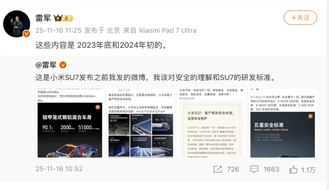 今年9月25日的年度演讲中,雷军曾坦言小米汽车发布后成为全网被恶意攻击最严重的品牌之一,当时他就呼吁社会共同抵制黑公关和水军。此次针对“重颜值轻安全”质疑的回应,被视为雷军对网络水军的又一次正面反击。此外,雷军还附上2023年至2024年期间发布的三条微博截图,强调“这些是小米SU7发布前我对安全理念的阐述,也是SU7研发过程中坚守的安全准则”。