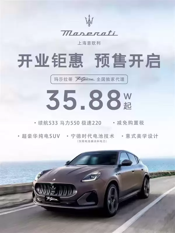 11月17日,《南京晨报》援引玛莎拉蒂部分门店在社交媒体发布的海报信息称,玛莎拉蒂Grecale Folgore纯电SUV车型起售价为35.88万元。海报显示,该车型采用宁德时代电池技术,续航里程达533公里,购车可免征车辆购置税。