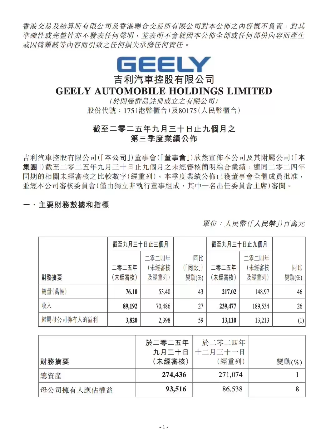 吉利汽车2025年三季度财报:净利38.2亿元,同比增长近六成