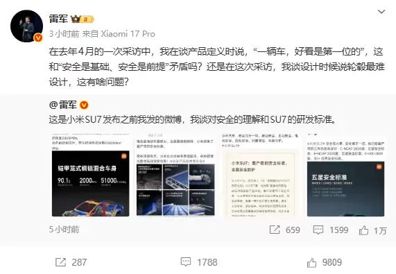 事件的起因要追溯到去年四月雷军接受采访时的一段表述被部分网友曲解。当时他提到“一辆车,好看是第一位的”,这句关于设计优先级的话被解读为小米汽车更重视外观而忽视安全性能。对此,雷军在最新发布的微博中反问道:“这和‘安全是基础、安全是前提’矛盾吗?”他进一步解释说,产品定位需要综合考虑多方面因素,出色的外观设计与严谨的安全理念本就相辅相成。