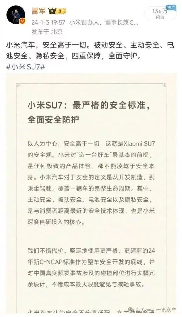 2025年1月3日,雷军进一步明确小米汽车的安全理念,称"安全高于一切",并从被动安全、主动安全、电池安全、隐私安全四个维度构建保障体系。他指出,小米汽车在研发过程中始终将安全放在首位,而非牺牲安全换取其他性能。