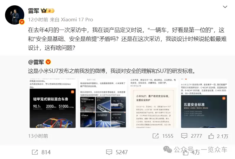 雷军在回应中提到,去年4月的一次采访中,他曾表示"一辆车,好看是第一位的",这一观点被部分网友曲解为忽视安全。他解释道,这一表述与"安全是基础、安全是前提"的理念并不矛盾,并反问:"设计时提到轮毂难设计,这有什么问题?"他强调产品的美观与安全性可以并存,不应被刻意对立。
