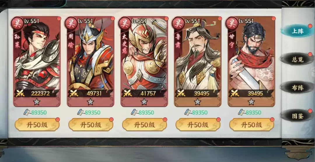 灼烧型阵容主要依靠持续的范围伤害,通过点燃敌人并触发技能联动来逐步削弱对手的战斗力。周瑜、陆逊、鲁肃、孙策、程普等武将都属于这一类型。周瑜负责点火,触发燃烧效果并造成持续性伤害;陆逊可作为引爆角色,放大已有的灼烧状态,迅速造成高额范围伤害;鲁肃和孙策则提供辅助输出以及前排承担伤害,确保阵容的稳定性。程普作为前排坦克,能够承受伤害并保护核心输出武将,从而增强整个团队的生存能力。