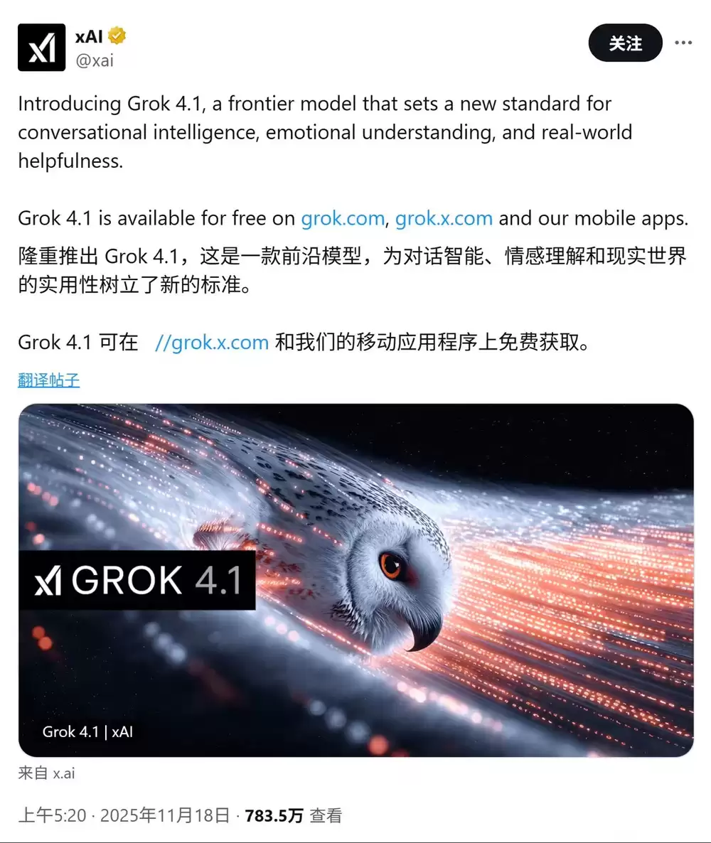 11月18日,埃隆·马斯克旗下人工智能公司xAI正式发布新一代大语言模型Grok 4.1,并已面向全体用户全面推送。