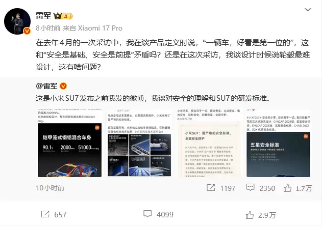 近期,小米汽车因安全问题成为舆论焦点,小米集团创始人雷军连续通过社交媒体发声,对相关质疑作出了详尽回应。此前,部分网友截取了雷军去年四月一段关于"一辆车,好看是第一位的"采访内容,将其解读为小米汽车将外观设计置于安全性能之上,由此引发讨论。对此,雷军在11月16日连发三条微博,强调"安全是基础、安全是前提",并指出美观与安全并非对立关系。