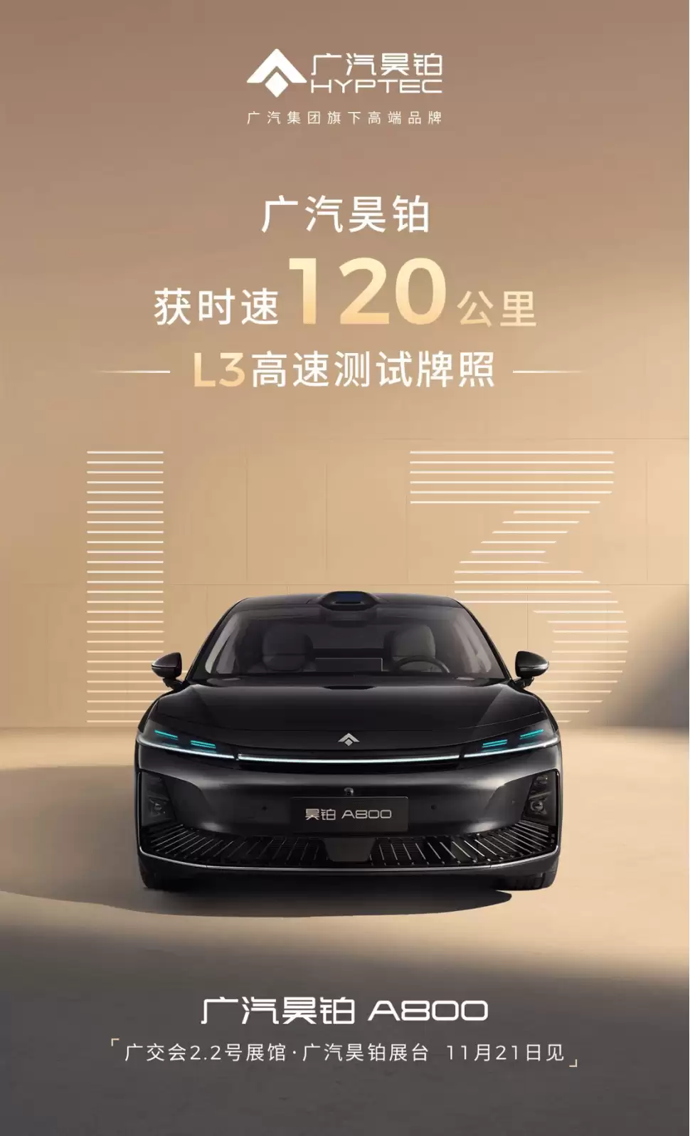广汽昊铂A800获L3高速测试牌照,11月21日亮相广州车展