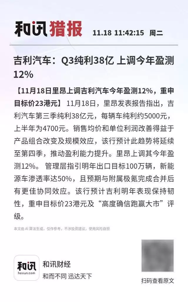 吉利Q3纯利多销 利润攀升至380亿,新能源目标可期
