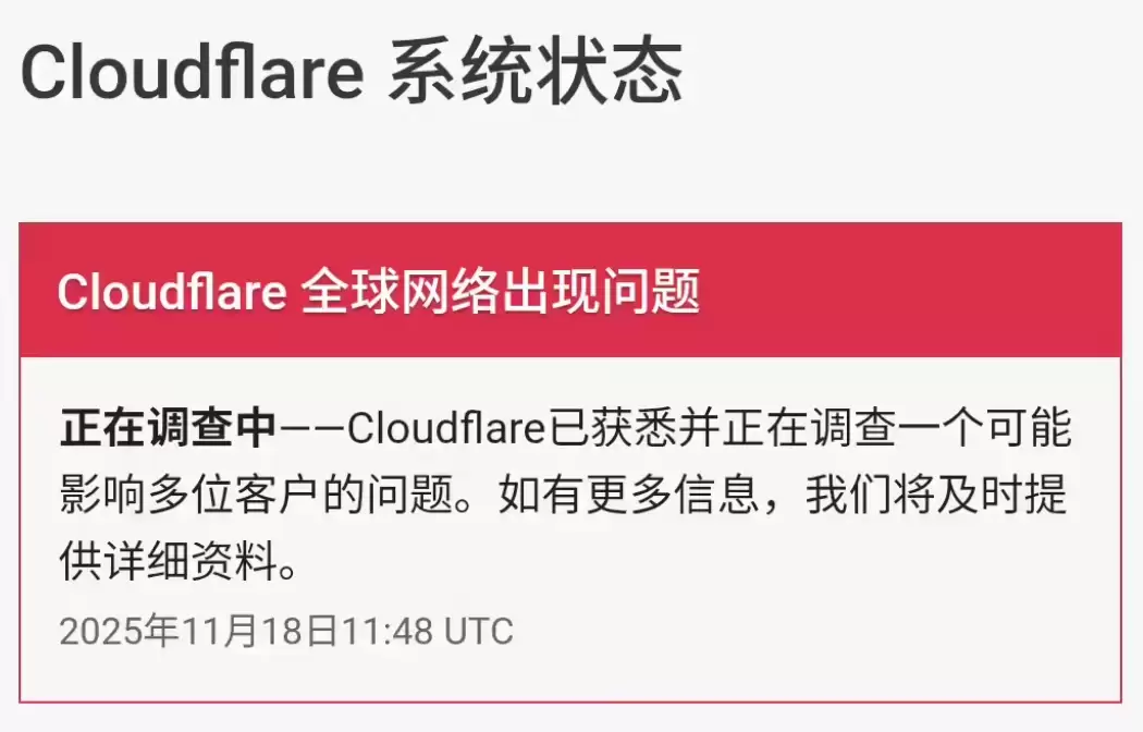 Cloudflare在最新公告中表示:“Cloudfare已获悉并正在调查一个可能影响多位客户的问题。若有更多信息,我们将及时提供详细资料。”