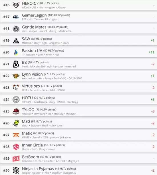 第11至20名区间的队伍排名变化不大。其中进步最为显著的是Passion UA战队,他们同样参加了BLAST对抗赛S2,在成功晋级淘汰赛阶段后,世界排名提升了11个位次。