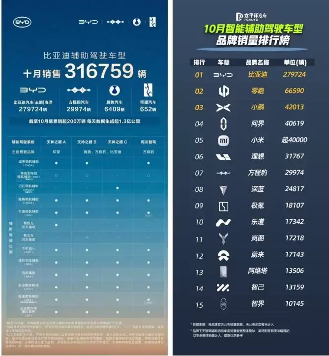 持续加码的研发投入构筑起比亚迪坚固的技术护城河。最新财报数据显示,今年前三季度比亚迪研发支出达到437.5亿元,同比增长31%,这一投入规模不仅在整个汽车行业中居于首位,更在全部A股上市公司中名列前茅。以智能驾驶领域为例,年初推出的"天神之眼"高阶智能驾驶辅助系统已实现规模化应用,截至10月底,搭载该系统的车型累计销量突破200万辆,系统日均生成的智能驾驶数据里程突破1.3亿公里。这种技术转化能力直接体现在市场表现上——在大平洋汽车发布的10月智能驾驶车型品牌销量榜单中,比亚迪以压倒性优势位居榜首,其销量达到第二名的四倍有余。