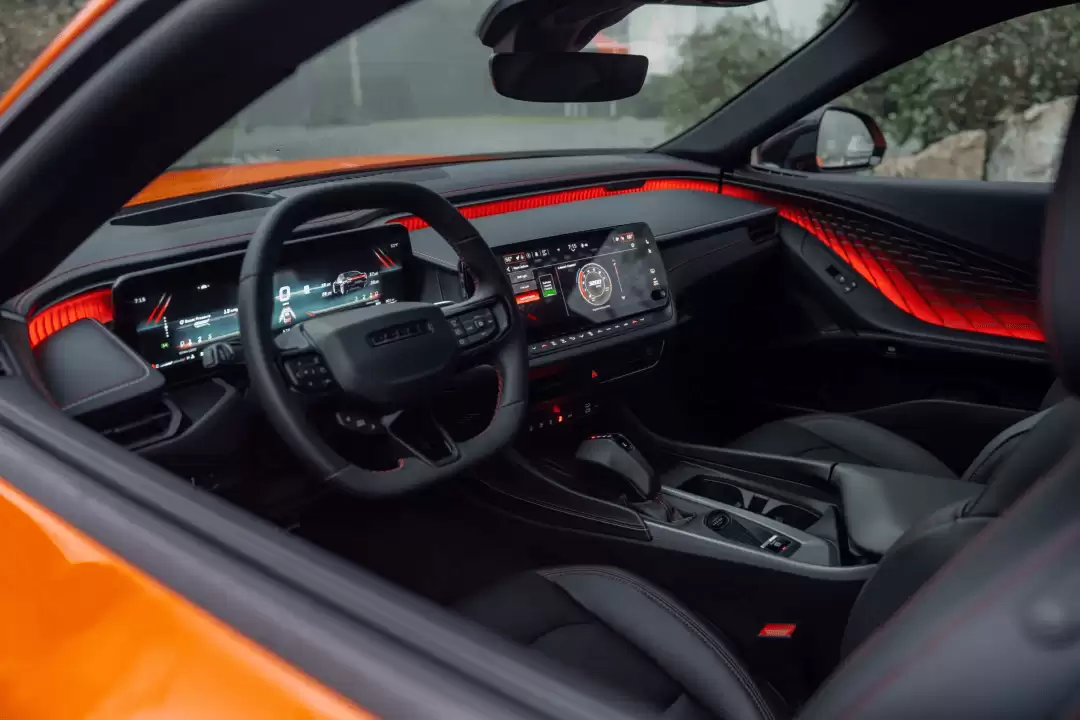 进入车内,Charger Sixpack同样带来惊喜。Scat Pack车型的中控台采用简洁未来主义的前倾式设计,可调氛围灯从中控台延伸至门板,营造出柔和且高端的视觉效果。驾驶者可通过信息娱乐系统自由调节氛围灯颜色,测试车型配备的碳纤维套件在灯光反射下更显精致。车内按键质感出色,多种触控材质的运用提升了使用体验。方向盘上的哑光黑色塑料虽略显廉价,但按压反馈清晰。空调控制系统集成在信息娱乐系统下方的触控面板上,虽非独立按键,但触觉反馈设计让操作更加直观。信息娱乐系统搭载Uconnect 5系统,运行流畅、操作便捷且高度可定制,驾驶者可根据喜好设置数字仪表盘,并将常用应用添加到主界面。