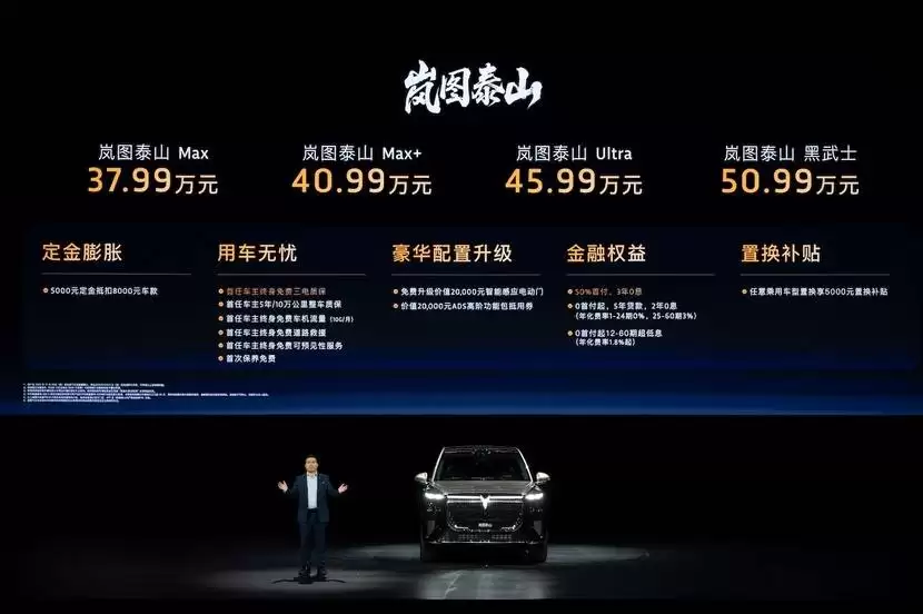 在深圳国际会展中心,岚图汽车正式推出全新旗舰SUV——岚图泰山,以四大车型Max版、Max+版、Ultra版及黑武士版惊艳登场,最新指导价区间为37.99万元至50.99万元。新车同步发布总价值4.8万元的上巿权益套餐,覆盖充电、保养、流量等多项专属服务,为用户打造全周期用车保障体系。