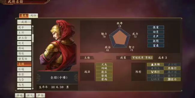 从属性来看,全琮是典型的中坚型全能武将。他的武力值达到72,统帅值高达78,智力也有75,这样的配置说明他既能坐镇指挥,也能亲自上阵杀敌。虽然45的初始速度不算出众,但高成长率让他在后期培养中依然潜力十足。政治和魅力虽不算突出,不过在担任内政任务或作为辅助角色时,依然能带来不错的收益。更重要的是,全琮的成长曲线十分平缓,这让他在游戏的各个阶段都能保持稳定的战斗力,不会出现前期强势后期乏力的现象。