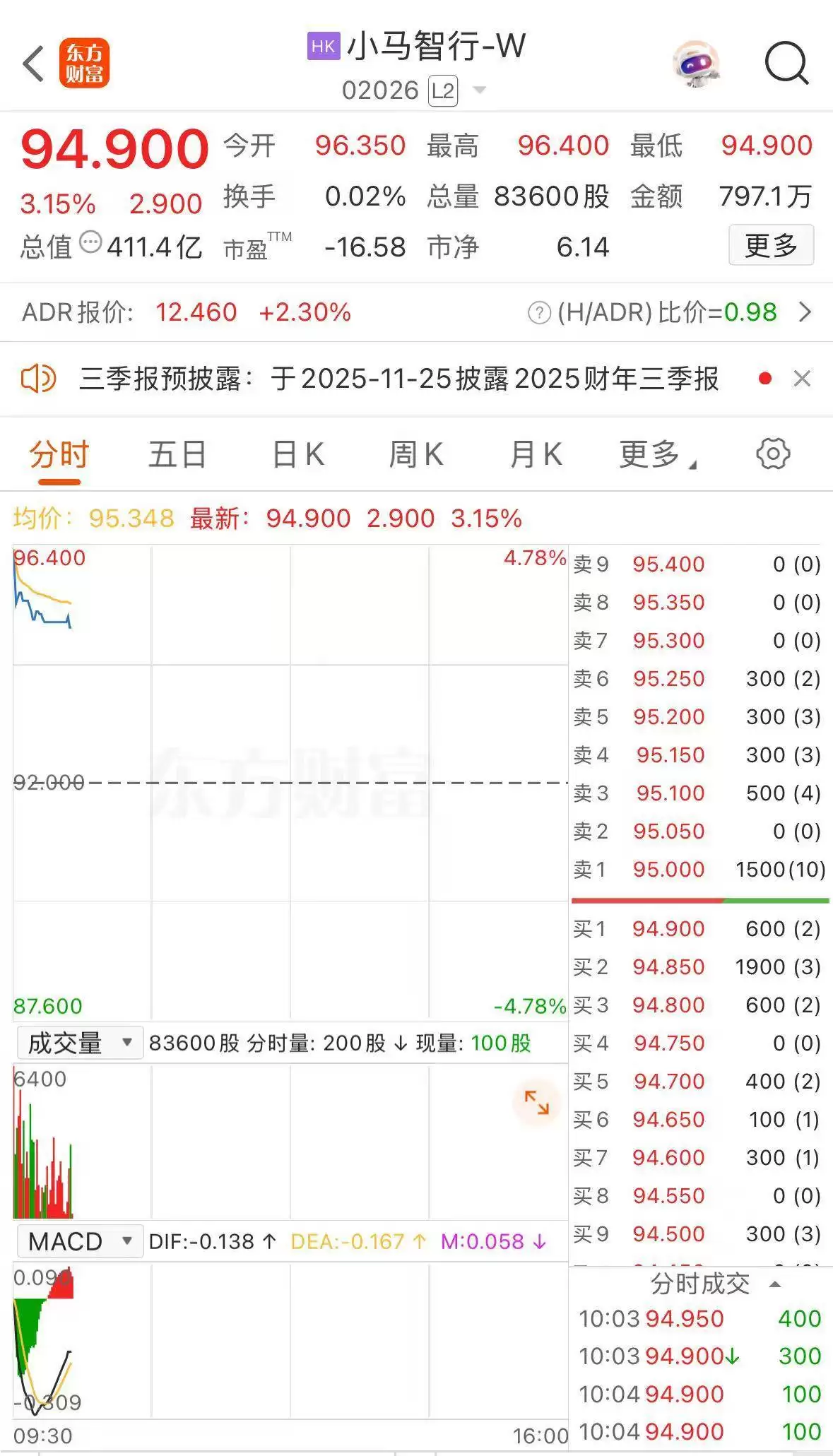 这一合作消息发布后,资本市场立即作出反应。11月19日早盘,小马智行-W股价大幅高开近5%,截至10时05分,虽然涨幅有所收窄,但仍保持在94.9港元/股,涨幅达3.15%。股价的积极走势反映出市场对小马智行此次战略布局的高度认可。