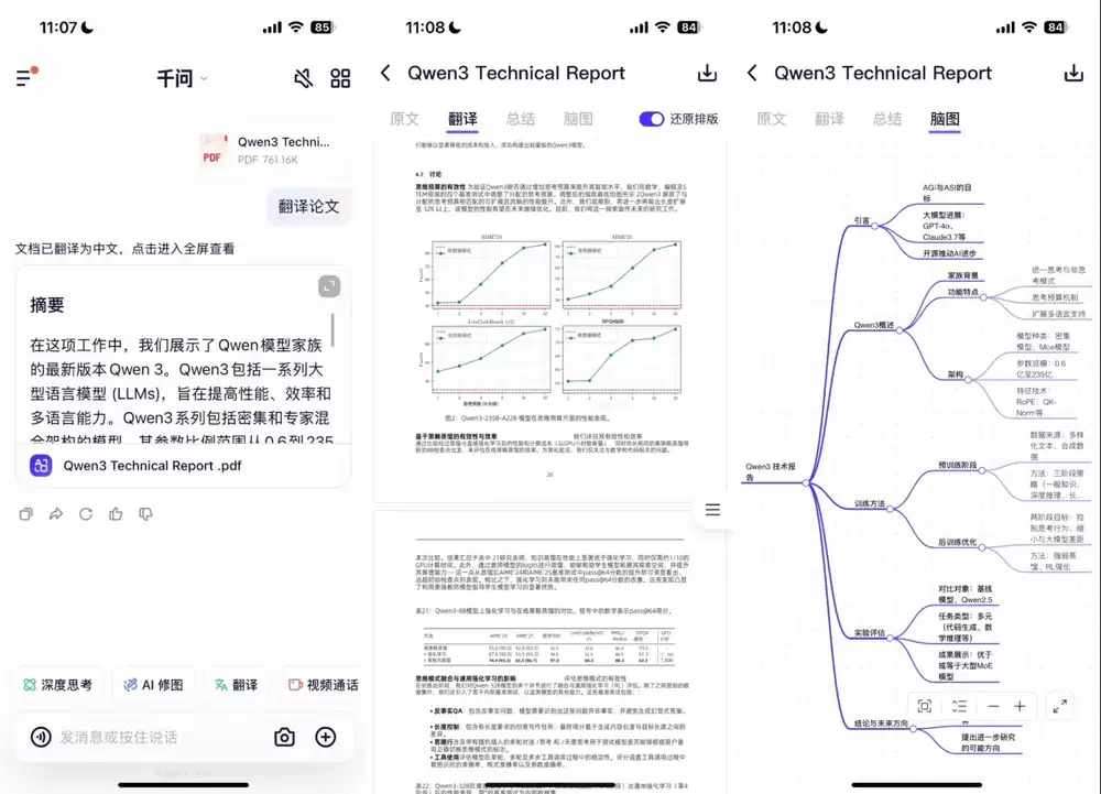 图注:千问App支持一键文档翻译,可在主对话内直接生成译文PDF,还能精准还原排版、生成导图