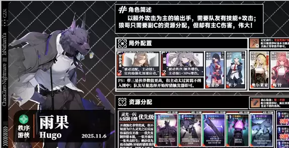 雨果的核心机制在于"开始狩猎"状态,当队友锁定攻击卡牌时,会消耗层数并触发额外追击。层数越高伤害倍率就越可观,这个特性直接决定了阵容构建的核心思路。通过合理配队,不仅能最大化追击伤害,当前最契合的正是奶刀狼阵容体系。这个阵容以雨果为主输出,搭配治疗位与德雷莎组成铁三角。为何这样搭配?首先德雷莎最大的优势在于不占用牌库空间,能持续产出技能牌与暗影匕首,为核心输出创造绝佳环境。