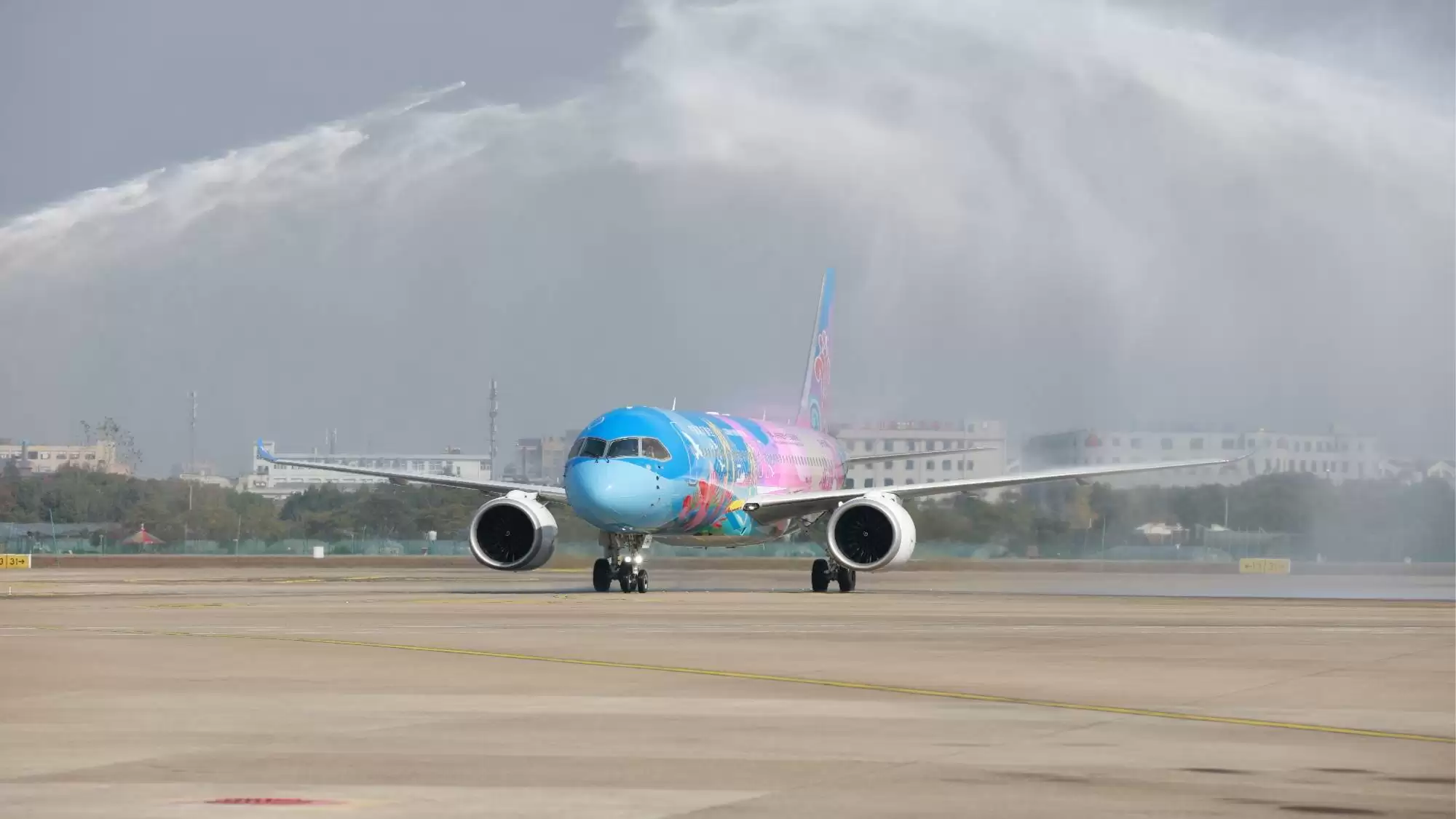 11月19日,央广网宁波消息(记者刘欣莹)11月18日上午10点24分,搭载着162名乘客的CZ3777航班平稳降落宁波栎社国际机场。这架绘有十五运彩绘、被称为“大美湾区号”的C919国产大飞机,注册号B-658W,在象征民航界最高礼遇的“水门”仪式中缓缓滑行通过。今后,宁波市民在家门口就能亲身感受我国航空工业的最新成果。