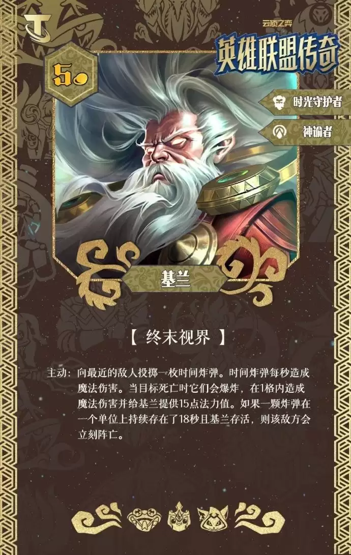 主动:向最近的敌人投掷一枚时间炸弹。时间炸弹每秒造成魔法伤害。当目标死亡时炸弹会立即爆炸,对1格范围内造成魔法伤害并为基兰回复15点法力值。如果一枚炸弹在同一个单位身上存在超过18秒且基兰依然存活,则该敌方单位会立即阵亡。