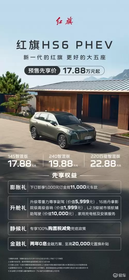 红旗品牌近日正式开启全新大五座插电混动SUV——红旗HS6 PHEV的预售通道,推出三款不同配置车型:145智混版预售价17.88万元,240智混版预售价19.88万元,220四驱智混版预售价22.88万元。这款定位旗舰的车型不仅以极具竞争力的价格切入市场,更在空间、舒适性、实用性、车机交互、视野通透度、混动技术、品质把控、可靠性、智能驾驶及质价比十个维度,重新定义了大五座混动SUV的价值标准,成为20万元级国产新能源SUV的热门之选。