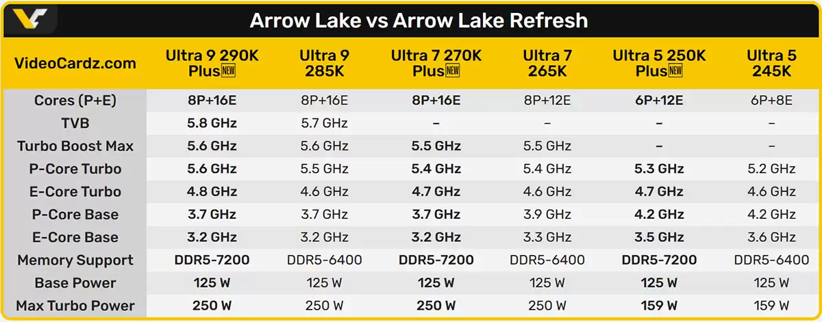 关于即将到来的Arrow Lake Refresh,Videocardz透露了三款未锁频K系列型号的具体规格:酷睿Ultra 9 290K Plus、酷睿Ultra 7 270K Plus和酷睿Ultra 5 250K Plus。新一代处理器将默认内存支持频率从6400MT/s提升至7200MT/s,而TDP则维持在125W不变。