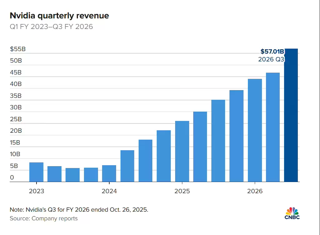 11月20日,英伟达发布2026财年第三季度财报(截至10月26日),各项业绩指标均创下历史新高。报告显示,公司本季度实现创纪录营收570亿美元,较去年同期的350.8亿美元大幅增长62%,相比上一季度的467.4亿美元也提升了22%。