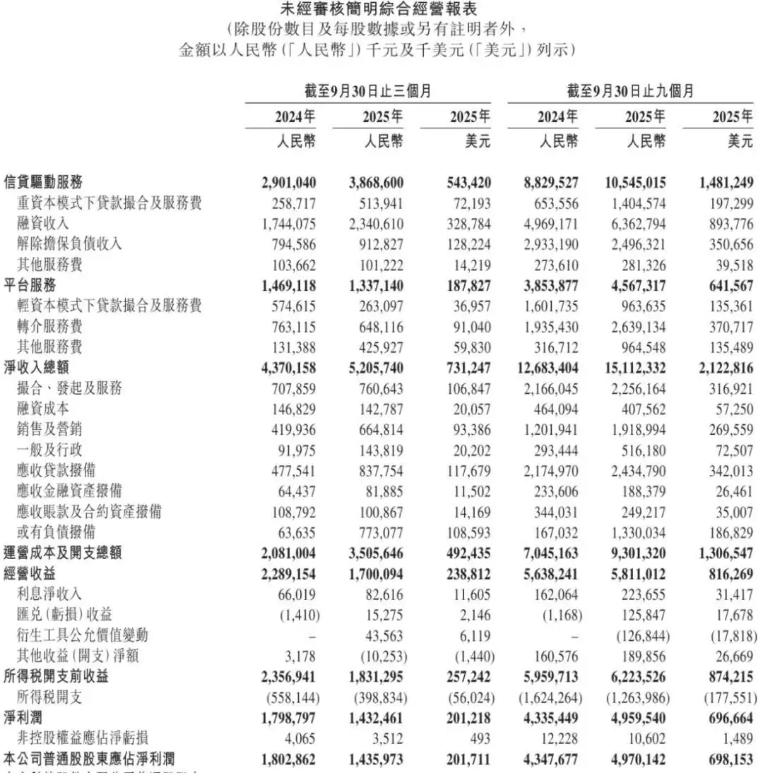 财务表现呈现结构性分化特征。第三季度净收入总额52亿元,同比增长19%。具体来看,信贷驱动服务收入38.69亿元,平台服务收入13.37亿元。细分项目中,融资服务收入同比大幅增长34.2%至23.4亿元,解除担保负债收入增长14.7%至9.12亿元。成本端压力明显上升,总运营成本支出35亿元,同比激增68%,主要受销售及营销开支(增长58.3%)、应收贷款拨备(增长75.3%)和或有负债拨备(增长1115%)三项支出共同驱动。