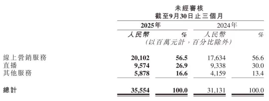 从收入结构来看,快手线上营销服务收入在第三季度达到201亿元,同比增长14%。其中,AI技术在营销素材匹配与出价等环节的深入应用,显著提升了运营效率。数据显示,AI技术为国内线上营销服务收入贡献了约4-5%的增长。同时,AIGC营销素材带来的线上营销服务消耗金额已突破30亿元,表明AI生成内容在营销场景中的渗透率正稳步提升。