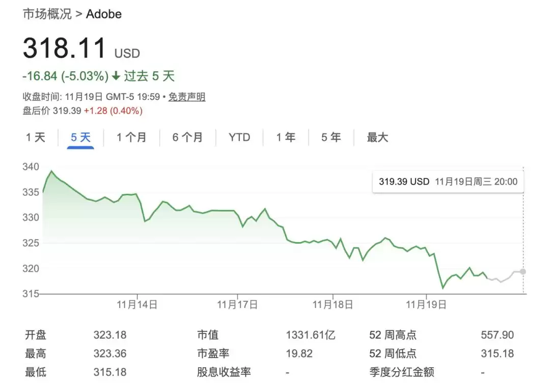 与此同时,Adobe股价则出现5%的跌幅。11月19日收盘时,Adobe股价为318.11美元(约合人民币2264元)/股,市值维持在1331.61亿美元(约合人民币9478亿元)。