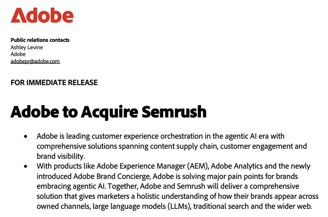 根据双方达成的最终协议,Adobe将以每股12.00美元(约合人民币85元)的现金交易形式完成对Semrush的收购,整体股权价值约19亿美元。该交易预计将在2026年上半年正式完成。
