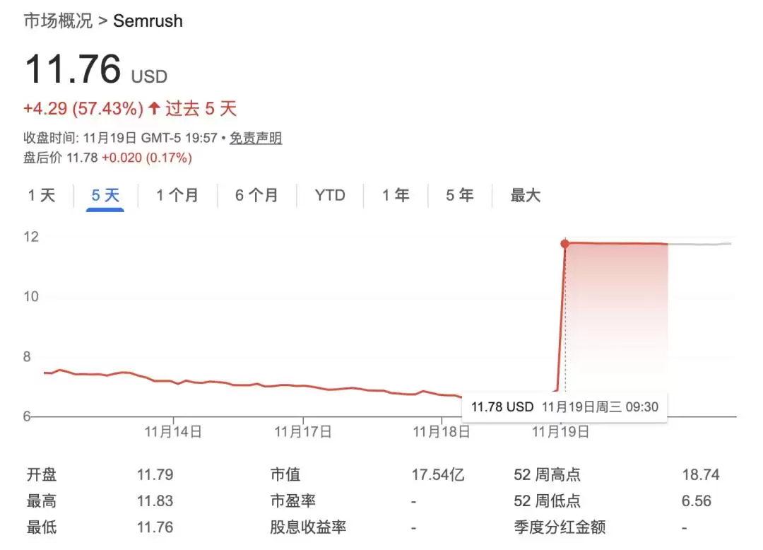 收购消息公布后,Semrush股价应声暴涨70.97%,创下该公司有史以来的最佳单日表现。截至11月19日收盘,该公司股价报收于11.76美元/股(约合人民币84元),市值攀升至17.54亿美元(约合人民币125亿元)。
