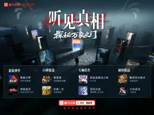 2025喜马拉雅悬疑季将持续至11月26日。即日起,打开喜马拉雅App,搜索"悬疑季",进入"听见真相·探秘万象之门"活动页面,即可畅享海量高品质悬疑内容,加入这场沉浸式互动探秘之旅。