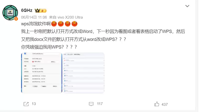 目前在社交媒体上,关于WPS擅自更改文件打开方式的讨论非常热烈,这种行为其实比弹窗广告更影响使用体验。知名数码博主6GHz曾分享经历:刚把默认打开方式改成Word,下一秒因为查看图片或表格启动了WPS,结果又把docx文件的默认打开方式从Word改回了WPS。