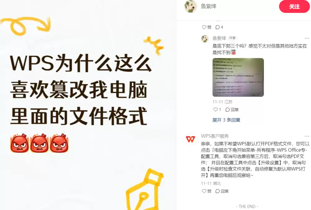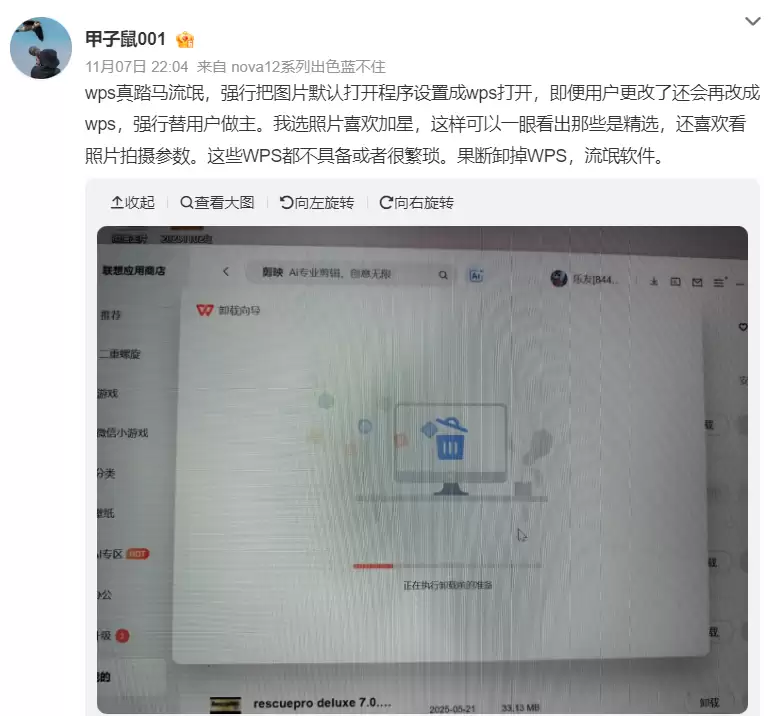 还有用户举例说,百度网盘至少还提供了取消按钮,而WPS则是直接强制安装图片查看器并替换系统默认程序。更令人无奈的是,它不仅改变了图片打开方式,甚至连文档、电子书等格式也一并接管,即使关闭程序,过段时间仍会自动重新关联。